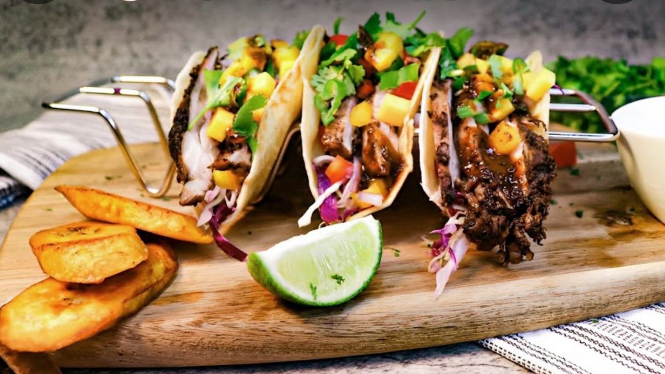 Three tacos filled with jerk-spiced salmon, fresh slaw, and zesty sauce.